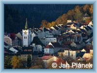 An industrial town situated in the forested region of the Vimperská Vrchovina highlands at the foot of mountain Boubín. It is of mediaeval origin and flourished due to its position on the Golden path. A chateau situated on a steep rock, originally an Early Gothic castle from the 13rd century which underwent reconstruction and adaptation in later years, looks down on the town. The local church of St. Mary from the 14th century has the appearance lent it by its reconstruction in the 19th century. The Vimperk printing works has a tradition of whole centuries´ standing.